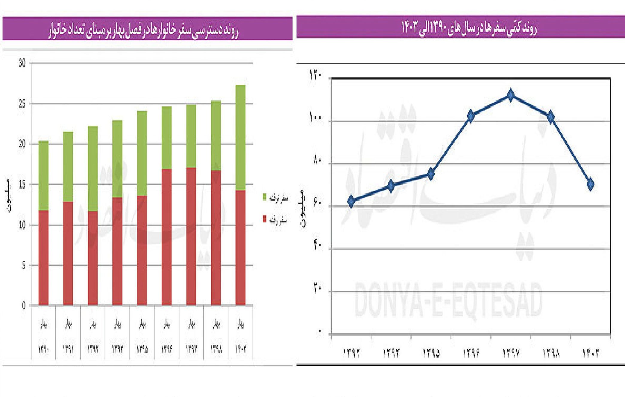 در سال ۱۴۰۳ «فقر سفر» روی قله قرار گرفت. در این سال ۴۸ درصد از خانوارهای ایرانی سفر نرفته و تنها ۵۲ درصد حداقل یک مسافرت داشتند. این در حالی است که این عدد در سال ۱۳۹۷ یعنی «سال طلایی سفر» به ۳۱ درصد برای سفر نرفتهها میرسید و در مقابل ۶۹ درصد حداقل یک مسافرت داشتند.