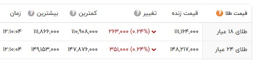 در بازار نرخ هر گرم طلای 18 عیار با 26 هزار تومان کاهش و با نرخ 11 میلیون و 116 هزار تومان در بازار طلا معامله شد. سکه امامی با 180 تومان افزایش به 115 میلیون و 485 هزار تومان قیمت گذاری شد. سکه بهار آزادی با 310 هزار تومان کاهش به 109 میلیون و 485 هزار تومان رسید. نرخ نیم سکه و ربع سکه به ترتیب 61 میلیون و 300 هزار تومان و 34 میلیون و 900 هزار تومان در تابلو اعلان قیمت‌ها نمایان شد.