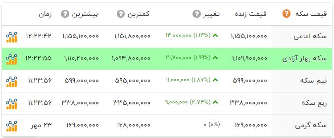 به گزارش آخرین خبر و تا لحظه تنظیم این خبر، سکه امامی با رشد یک میلیون و 300 هزار تومانی قیمت، 115 میلیون و 510 هزار تومان به ثبت رسید. نیم سکه با افزایش یک میلیون و 100 هزار تومانی قیمت، 59 میلیون و 900 هزار تومان ارزش گذاری شد.