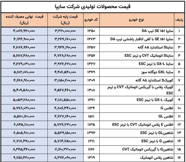 در ادامه قیمت های محصولات سایپا در تیر ماه را مشاهده میکنید: