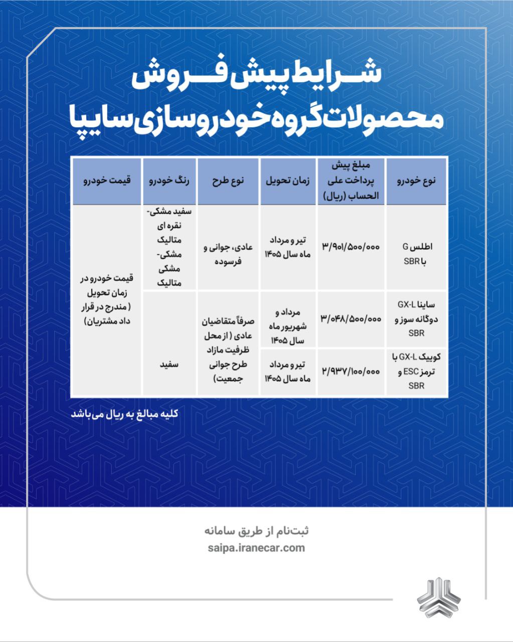 آخرین خبر/ ثبتنام فروش محصولات گروه سایپا ویژه متقاضیان عادی، طرح جوانی جمعیت و حمایت از خانواده و طرح جایگزینی خودروهای فرسوده از ساعت ۱۰ روز یکشنبه ۱۸ آبانماه ۱۴۰۴ آغاز میشود.