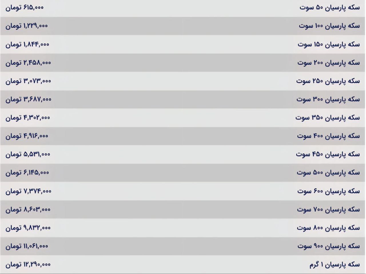 قیمت سکه پارسیان امروز یکشنبه ۹ آذر ۱۴۰۴ روی رقم ۱۲ میلیون و ۲۹۰ هزار تومان برای هر گرم قرار گرفت. همچنین، قیمت سکه پارسیان ۵۰ سوت با رقم ۶۱۵ هزار تومان به ثبت رسید.
