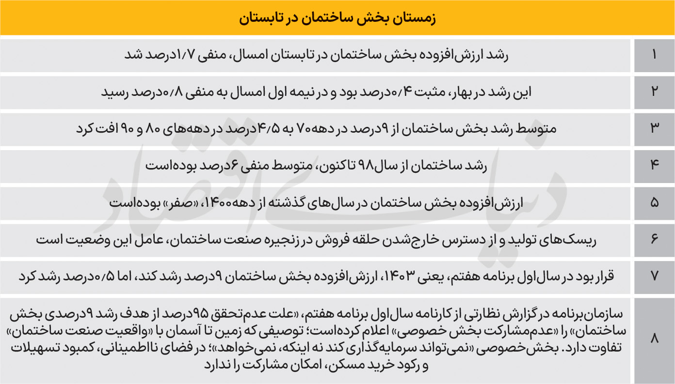 بدترین تحلیل درباره وضعیت زیرصفر بخش ساختمان، میتواند عبارتی باشد که ناظران اجرایی برنامه هفتم در گزارش عملکرد سالاول این برنامه، در جلوی ردیف «احداث مسکن توسط بخش خصوصی» نوشتهاند: «عدممشارکت بخش خصوصی.»نویسندگان «کارنامه سالاول برنامه هفتم» تصورشان این است که «سرمایهگذاران ساختمانی و سازندهها در سالگذشته، تمایل به تولید نداشتهاند یا وقتشان را جای دیگری گذراندهاند.» اما واقعیت، کاملا «متضاد» از این «تحلیل دولتی» است. ساختمانیها نهتنها، نیمه اول امسال، نهتنها از سالگذشته، که از سال98 تاکنون در شرایط «غیرقابلتولید» ناشی از ریسکهای اقتصادی، ریسکهای غیراقتصادی و رکود سریالی خرید مسکن قرار دارند. البته بخشی از ارزشافزوده بخش ساختمان، مربوط به ساختمان دولتی یا همان پروژههای عمرانی و زیرساختی است و بخشی از آن، مربوط به «ساختوسازهای بخشخصوصی شامل مسکونی و غیرمسکونی» میشود. اما از آنجا که طبق برآوردها، سهم تولید بخشخصوصی قابلتوجه است و در عینحال احتمالا شوکهای بیرونی، این قسمت را با شدت بیشتری نسبت به پروژههای عمرانی تحتتاثیر قرارداده، عمده کاهش صورتگرفته در روند ارزشافزوده بخش ساختمان از این محل بودهاست.