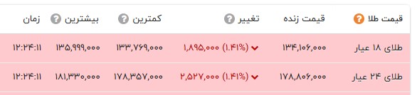 در بازار نرخ هر گرم طلای 18 عیار با 189 هزار تومان کاهش و با نرخ 13 میلیون و 410 هزار تومان در بازار طلا معامله شد. سکه امامی با 2 میلیون و 315 هزار تومان کاهش به 139 میلیون و 480 هزار تومان قیمت گذاری شد. سکه بهار آزادی با 2 میلیون و 850 هزار تومان افزایش به 133 میلیون و 720 تومان رسید. نرخ نیم سکه و ربع سکه به ترتیب 76 میلیون و 80 تومان و 43 میلیون و 430 هزار تومان در تابلو اعلان قیمتها نمایان شد.