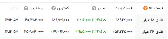 در بازار نرخ هر گرم طلای 18 عیار با 221 هزار تومان افزایش و با نرخ 18 میلیون و 917 هزار تومان در بازار طلا معامله شد. سکه امامی با 985 هزار تومان افزایش به 192 میلیون و 980 هزار تومان قیمت گذاری شد. سکه بهار آزادی با 605 هزار تومان افزایش به 186 میلیون و 515 هزار تومان رسید. نرخ نیم سکه و ربع سکه به ترتیب 98 میلیون و 990 هزار تومان و 54 میلیون و 990 هزار تومان در تابلو اعلان قیمتها نمایان شد.