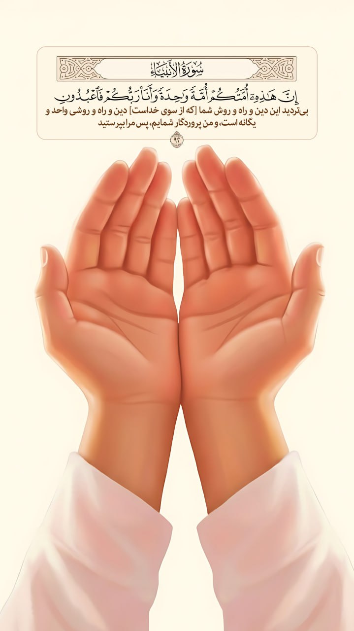 بیتردید این دین و راه و روش شما [که از سوی خداست] دین و راه و روشی واحد و یگانه است، و من پروردگار شمایم، پس مرا بپرستید