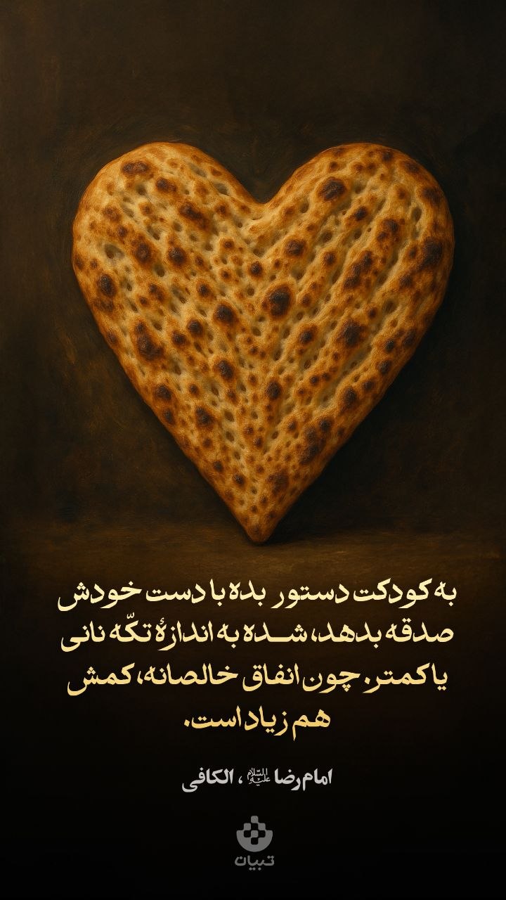 تبیان/ به کودکت دستور بده با دست خودش صدقه بدهد، شده به اندازۀ تکّه نانى یا کمتر. چون انفاق خالصانه، کمش هم زیاد است.امام رضا علیهالسلام، الکافی
