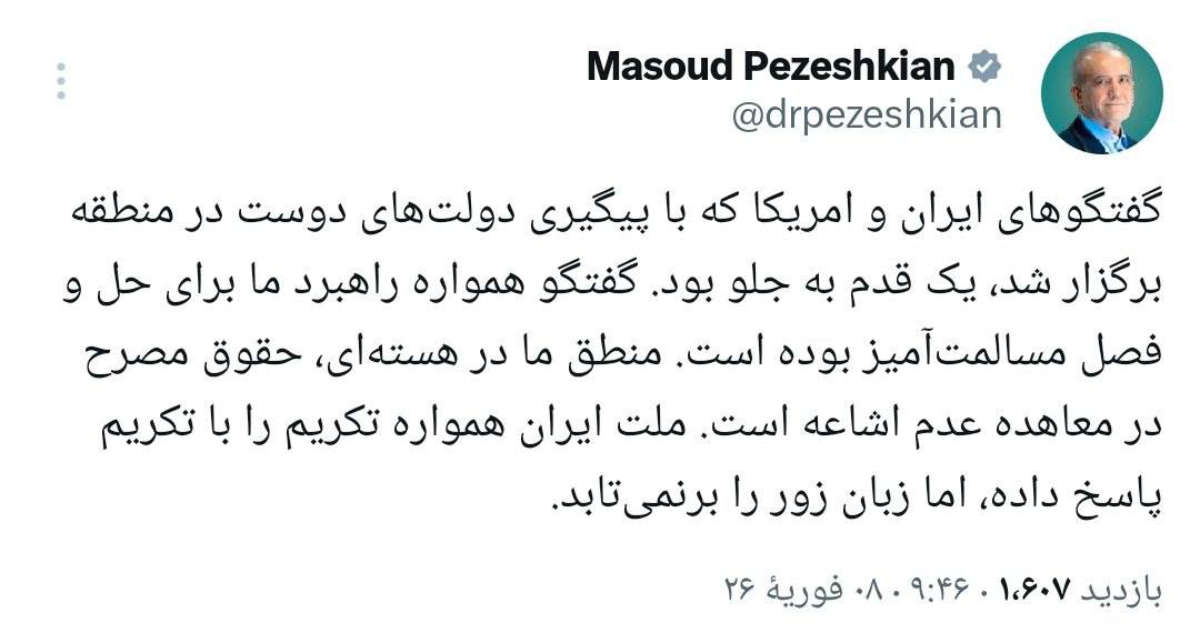 مسعود پزشکیان در حساب کاربری خود در شبکه اجتماعی ایکس نوشت: