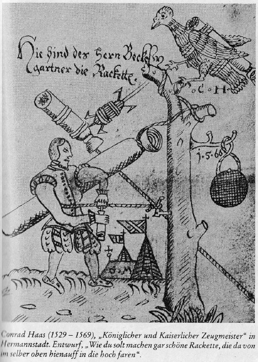 با این حال، مشخص نیست که هاس موفق به اجرای عملی طرحهای خود شده باشد، گرچه ادعاهایی مبنی بر پرتاب موشک در سیبیو در سال ۱۵۵۰ وجود دارد که فاقد شواهد مستند است. پیش از کشف این نسخه، جوهان اشمیدلاپ، سازنده آتشبازی آلمانی، حدود سال ۱۵۹۰ با موشکهای دو و سهمرحلهای آزمایشهایی انجام داده بود. همچنین، قدیمیترین جزئیات مستند موشک سهمرحلهای به کاژیمیرز سیمینوویچ در سال ۱۶۵۰ نسبت داده میشد.