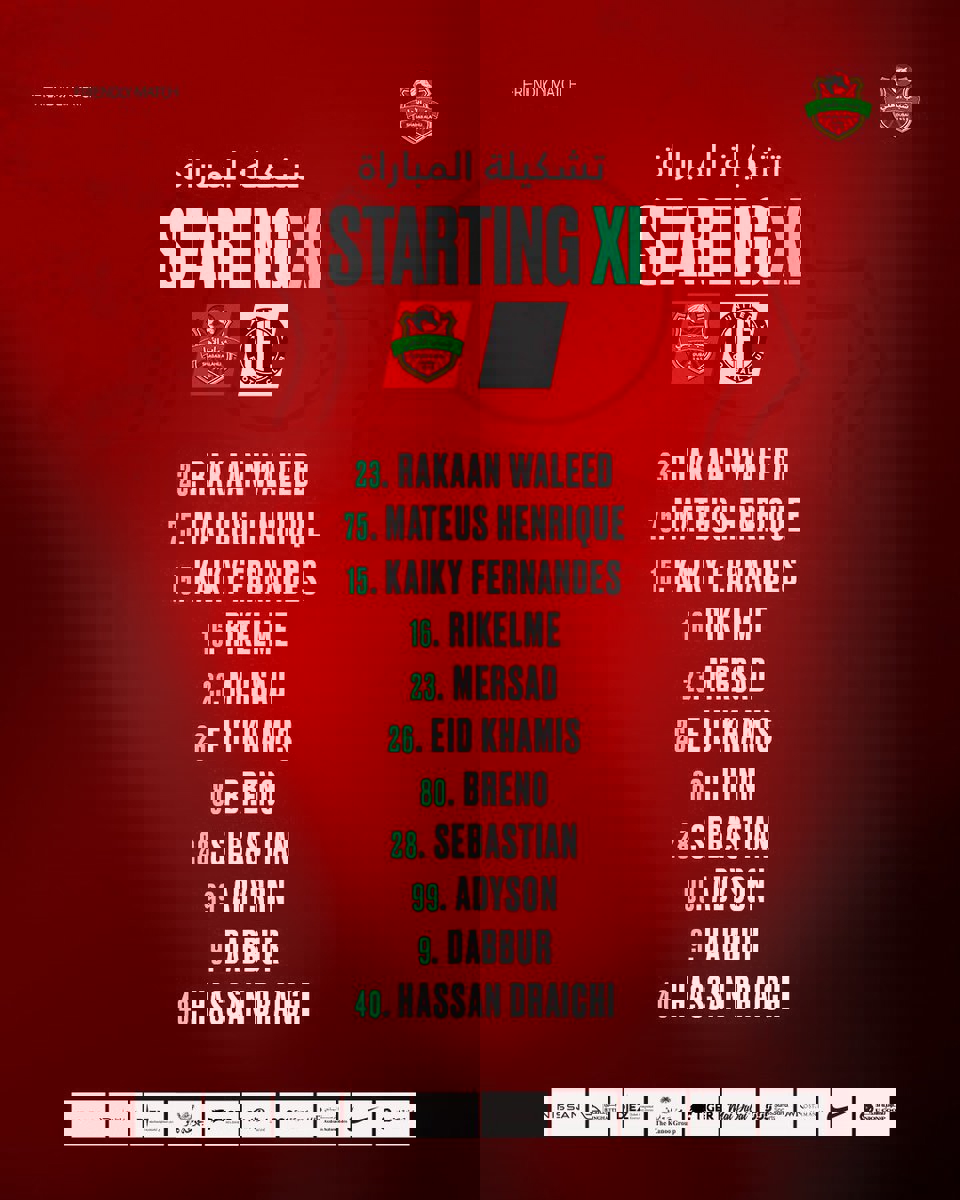 شباب الاهلی در حالی از ساعت 18 امروز (به وقت ایران) در ورزشگاه راشد دبی به مصاف شاگردان پیرلو رفته که پائولو سوسا تصمیم گرفته از مرصاد سیفی، مدافع چپ ایرانی خود در ترکیب اولیه استفاده کند.