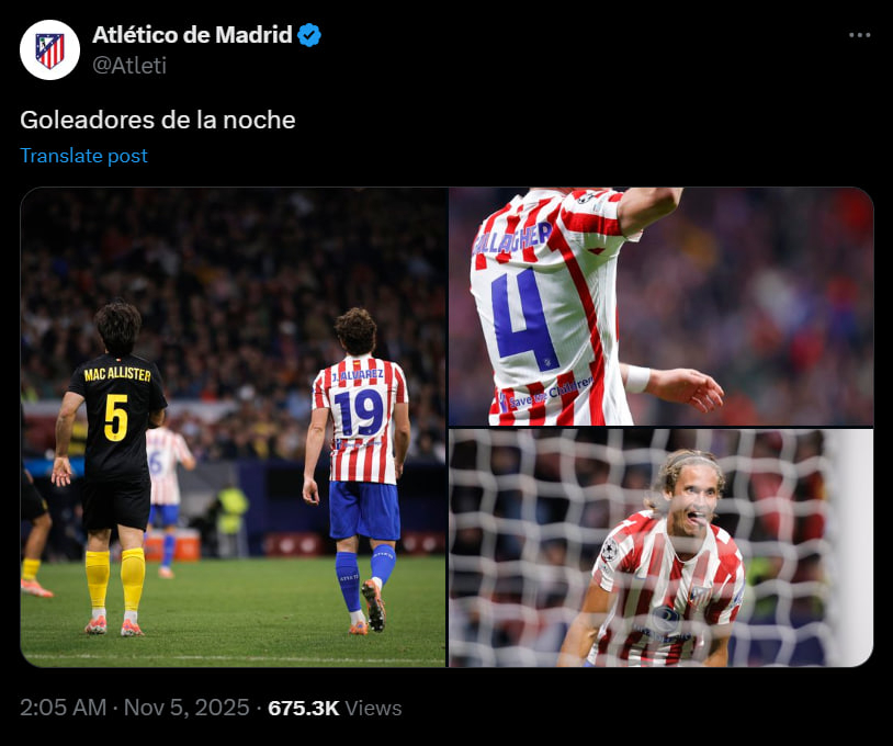 از همین جا پیام ظریف (یا شاید طعنهآمیز) حساب رسمی اتلتیکومادرید در شبکههای اجتماعی شکل گرفت. اتلتیکو پستی را در شبکه اجتماعی ایکس (توییتر سابق) منتشر کرد و گلزنی بازیکنانش در شب گذشته را تبریک گفت. در تصویر، مارکوس یورنته، کانر گالاگر و خولیان آلوراز حضور داشتند. تا اینجا هیچ چیز غیرعادی نبود.