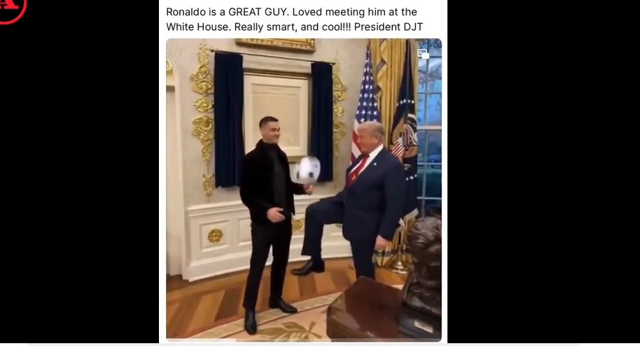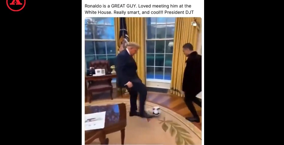 دونالد ترامپ، رئیس جمهور ایالات متحده، میزبان کریستیانو رونالدو در اتاق بیضی کاخ سفید بود. او کلید اقامتگاه رسمی را به رونالدو داد و باهم عکس گرفتند، اما آنها روپایی زدن با توپ را انجام ندادند. به همین دلیل، رئیس جمهور بار دیگر از یک ویدیوی ساخته شده با هوش مصنوعی استفاده کرد تا همین کار را به تصویر بکشد. روپایی زدن با پا و سر، با چابکی خیرهکننده، لحظهای که حتی به شکلی غیرعادی به پایان میرسد.
