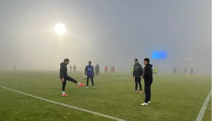 مهگرفتگی شدید و کاهش دید میدانی باعث شد تا داور مسابقه دستور به تاخیر در شروع بازی دهد. طبق پروتکلها، این دیدار فعلاً با ۳۰ دقیقه تاخیر روبرو شده است. اگر پس از این مدت شرایط دید بهبود نیابد، داور ۳۰ دقیقه دیگر نیز صبر خواهد کرد و در صورتی که همچنان امکان برگزاری بازی وجود نداشته باشد، این مسابقه با تصمیم ناظر و داور به مدت ۲۴ ساعت به تعویق خواهد افتاد.