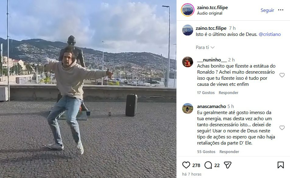 انتشار ویدیویی عجیب از این کاربراینستاگرام که مجسمه رونالدو را به آتش می‌کشد و در متن آن این ستاره پرتغالی را تهدید می‌کند، موجی از خشم، ناباوری و واکنش‌های گسترده را در فضای مجازی به‌ دنبال داشته است. پای این پست قبل از حذف آن چنین کامنتهایی نوشته شده بود: «معمولاً از انرژی‌ات خوشم می‌آید،اما این بار این کار را کاملاً اضافی می‌دانم… آنفالو کردم. استفاده از نام خدا در چنین اقداماتی درست نیست. فقط امیدوارم واکنشی از جانب او در کار نباشد.»