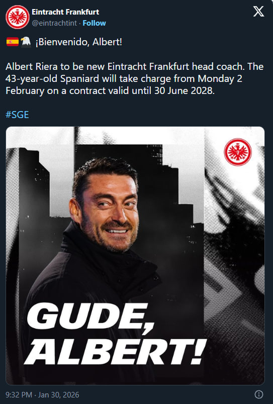 مارکوس کروشه، عضو هیئت‌ مدیره فرانکفورت، در این باره گفت: «ما با آگاهی کامل، آلبرت ریه‌را را به عنوان سرمربی انتخاب کردیم. مربی‌ای که فوتبال مدرن، پرفشار و هجومی ارائه می‌دهد. او تجربه بین‌المللی، فلسفه‌ای روشن در بازی و رویکردی کاملاً مشخص در کار روزمره با تیم دارد.