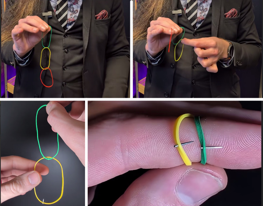 روش بازی: قبل از شروع بازی، سوزنها را کوتاه کرده و مانند شکل 3 به پایین هر کش فرو میکنید تا سر سوزن بیرون بماند. هنگام اجرا هم هر کش را به سوزن کش بالایی بند میکنید تا تماشاگر فکر کند که از داخل هم عبور کردهاند. به همین راحتی!