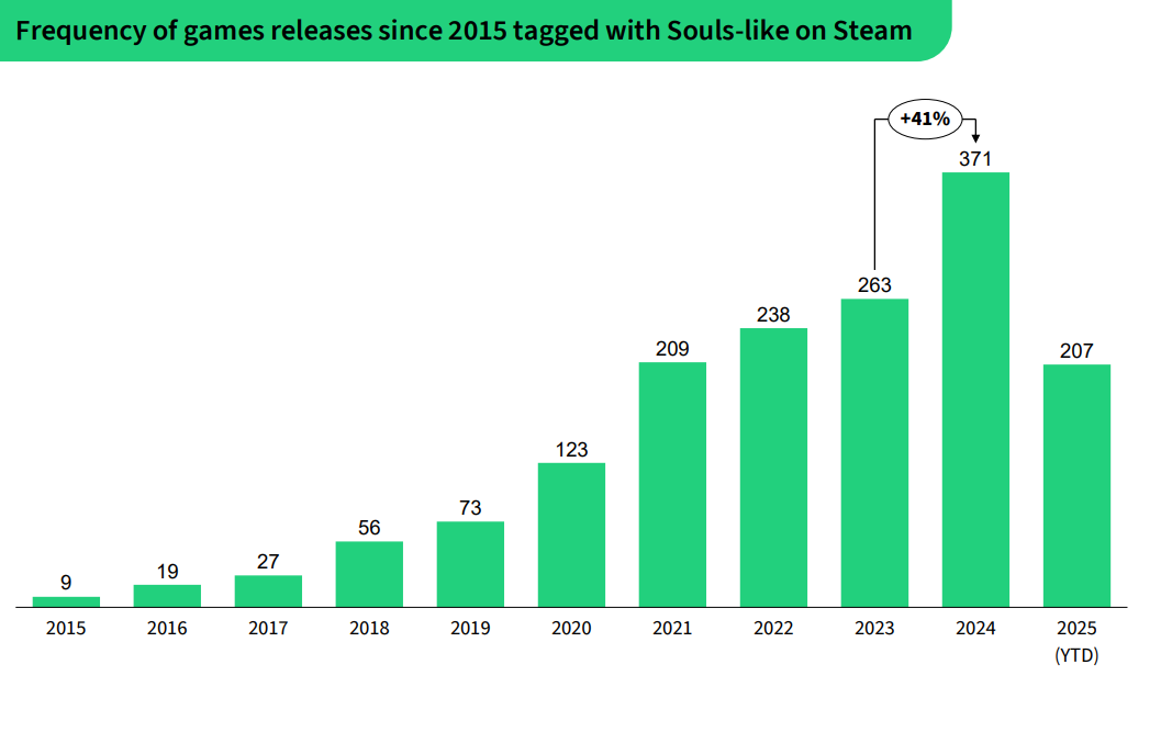 بر اساس این مطالعه، طی ۱۰ سال گذشته، تعداد بازیهایی که با برچسب «مشابه Dark Souls» منتشر شدند، هر سال افزایش یافته است. تنها در سال ۲۰۲۴، ۳۷۱ عنوان جدید با این برچسب در استیم عرضه شدند. این رقم ۴۱.۲ برابر بیشتر از تعداد بازیهای مشابه در سال ۲۰۱۵ است. با این حال، در سال ۲۰۲۵ (تا زمان نگارش این گزارش)، تنها ۲۰۷ عنوان جدید با این برچسب منتشر شدند؛ بنابراین احتمالاً رکورد سال گذشته شکسته نخواهد شد.