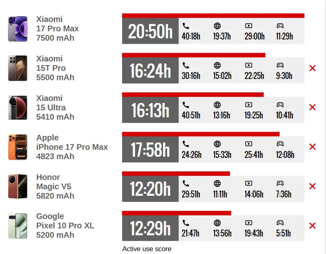 در میان رقبا، تنها اوپو فایند X9 پرو توانست در شاخص «مدت استفادهی فعال» امتیاز بالاتری بگیرد. با این حال، در برخی آزمونهای جداگانه، گوشی شیائومی برتری دارد؛ از جمله ۱۲ ساعت دوام بیشتر در تماس صوتی و چند دقیقهی اضافه در پخش ویدیو.
