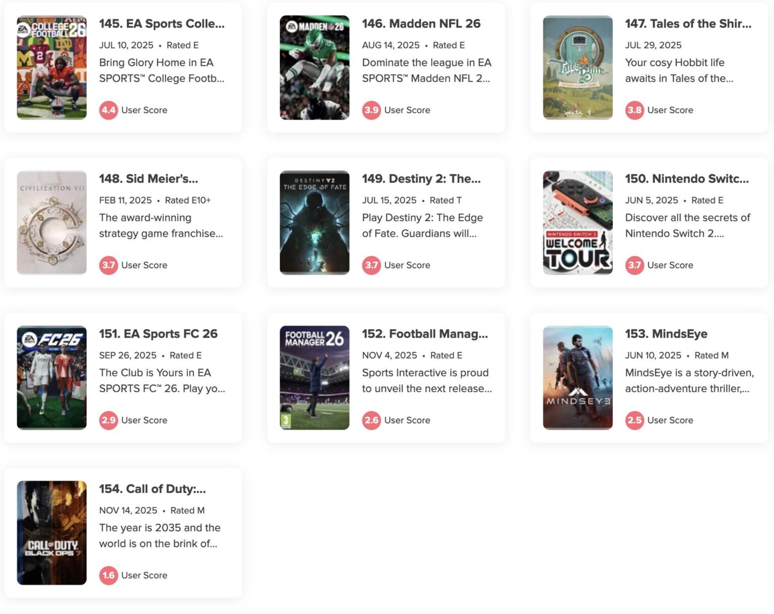اگر دیدگاه منتقدان را کنار بگذاریم و صرفاً به نظرات کاربران متاکریتیک تکیه کنیم، دهمین بازی با بدترین امتیاز در سال ۲۰۲۵ عنوان EA Sports College Football 26 با نمره ۴.۴ از ۱۰ خواهد بود. پس از آن بهترتیب Madden NFL 26 با امتیاز ۳.۹، Tales of the Shire با ۳.۸ و عناوینی مانند Sid Meier’s Civilization VII، Destiny 2: The Edge of Fate و Nintendo Switch 2 Welcome Tour همگی با امتیاز ۳.۷ قرار میگیرند. در ادامه نیز EA Sports FC 26 با نمره ۲.۹ و Football Manager 26 با امتیاز ۲.۶ دیده میشوند.