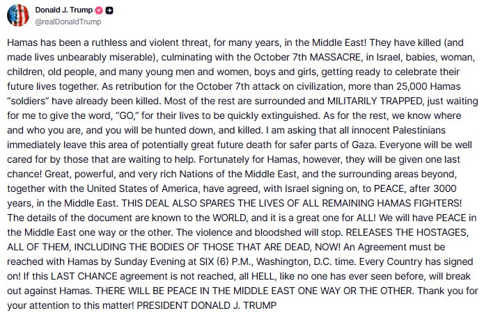 دونالد ترامپ نوشت: حماس«تهدیدی بیرحم و خشونتبار» در خاورمیانه است؛ بیش از ۲۵ هزار نیروی این گروه تاکنون کشته شدهاند و باقی آنها در محاصره نظامی قرار دارند.