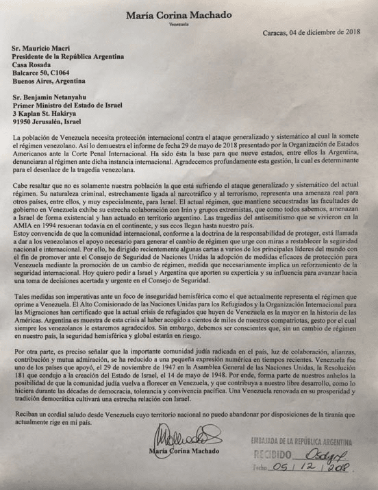 ماچادو در این نامه، که برای رئیسجمهور وقت آرژانتین مائوریسیو ماکری و بنیامین نتانیاهو ارسال شده بودف با اتهام زنی به دولت مادورو، مدعی شده بود که دولت ونزوئلا علیه مردم این کشور مرتکب جنایت میشود. در بخشهایی از این نامه، این اپوزیسیون ونزوئلایی، از رژیم صهیونیستی درخواست کمک کرده بود و نوشته بود «در این مرحله سرنوشتساز، کشور ما به حمایت کشورهای دموکراتیک، از جمله آرژانتین و اسرائیل، نیاز دارد تا مسیر آزادی را هموار کند. مطمئن هستم که ونزوئلا بار دیگر کشوری آزاد، دموکراتیک و شکوفا خواهد شد و مردم ما به خانه بازخواهند گشت.»