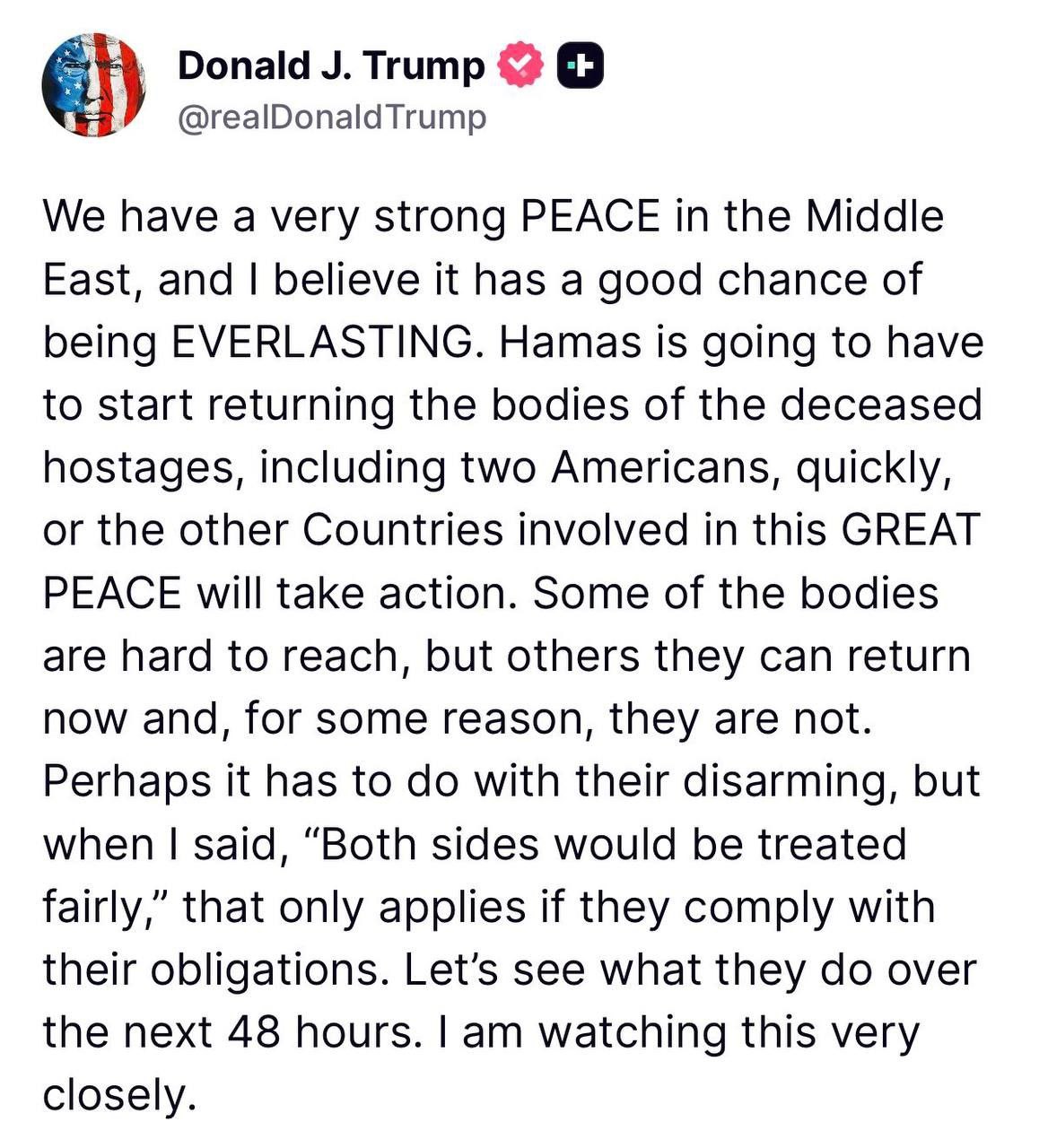 ما در خاورمیانه صلح بسیار قوی داریم و من معتقدم که این صلح شانس خوبی برای پایدار بودن دارد. حماس باید به سرعت شروع به بازگرداندن اجساد گروگانهای کشته شده، از جمله دو آمریکایی، کند، در غیر این صورت سایر کشورهای درگیر در این صلح بزرگ اقدام خواهند کرد.