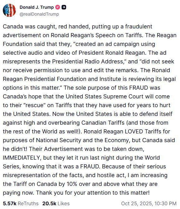 تابناک/رئیسجمهوری آمریکا تعرفه تجاری برای واردات کالا از کانادا را در پی اختلافات با اوتاوا بر سر یک آگهی تبلیغاتی که استان انتاریو آن را تامین مالی کرده بود، ۱۰ درصد افزایش داد.