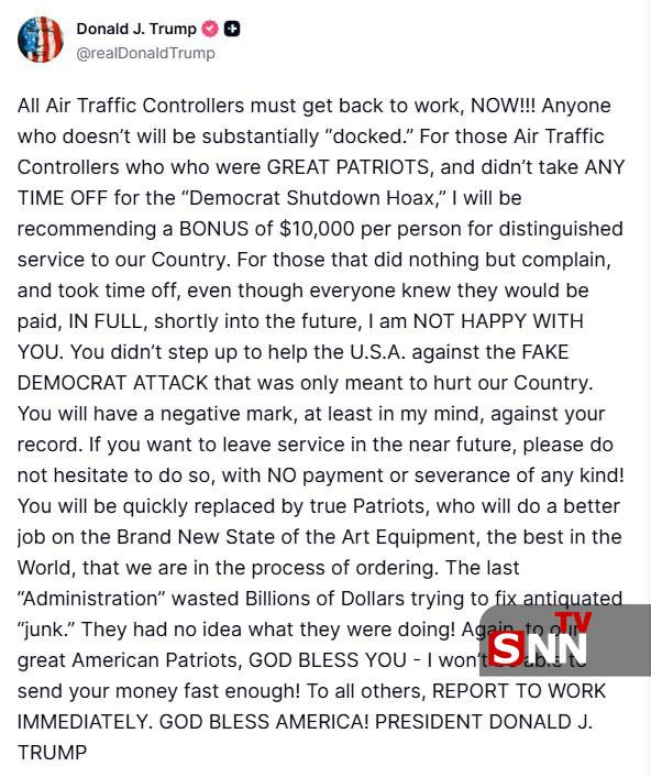 خبرگزاری دانشجو/ دونالد ترامپ در بستر تروث سوشال نوشت: «تمام کنترلرهای ترافیک هوایی باید فوراً به کار بازگردند، همین حالا! هرکس این کار را نکند، بهشدت جریمه خواهد شد. برای آنهایی که میهنپرست واقعی بودند و به خاطر "حقه تعطیلی دموکراتها" حتی یک روز مرخصی نگرفتند، پاداش ۱۰ هزار دلاری پیشنهاد خواهم داد.