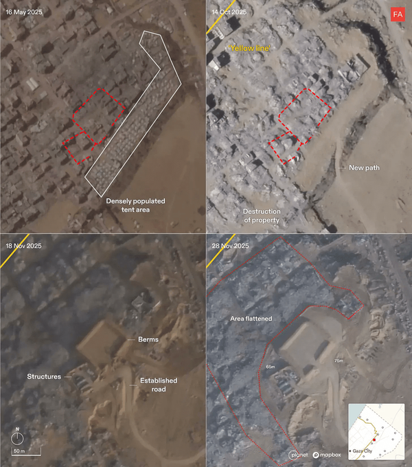 از سوی دیگر، سازمان بریتانیایی «Forensic Architecture» هفته گذشته تحلیلی از تصاویر ماهوارهای غزه منتشر کرد که نشان میدهد اسرائیل طی دوره آتشبس ۱۳ پایگاه جدید در امتداد «خط زرد» ــ خطی که مناطق تحت کنترل ارتش اسرائیل را از مناطق فلسطینی جدا میکند ــ ایجاد کرده است. بیشتر این پایگاهها در شمال غزه و شرق خان یونس ساخته شدهاند و شمار پایگاههای ارتش اسرائیل در امتداد خط زرد را به ۴۸ رساندهاست. گزارش مذکور، همچنین اشاره کرده است که ارتش اسرائیل برخی جادههای ارتباطی این پایگاهها با اراضی اشغالی را گسترش داده و یک جاده جدید در منطقه خان یونس احداث کرده است. این سازمان همچنین از گسترش دامنه تخریب در خان یونس و عملیات پاکسازی آوار در رفح خبر داده است. در همین زمینه، مرکز ماهوارهای سازمان ملل در اکتبر گذشته اعلام کرده بود که ۸۱٪ از ساختمانها و زیرساختهای غزه در جریان جنگ بهطور جزئی یا کلی تخریب شدهاند. طبق تحلیل سازمان ملل، ۱۲۳ هزار و ۴۶۴ ساختمان بهطور کامل نابود شده، ۱۲ هزار و ۱۱۶ ساختمان آسیب شدید دیده و ۳۳ هزار و ۸۵۷ ساختمان دچار خسارت متوسط شدهاند. در هفتههای اخیر چندین ساختمان آسیبدیده در اثر باران و طوفان فرو ریخته و به شهادت و جراحت فلسطینیان انجامیده است. حتی روز گذشته پنج نفر در پی فرو ریختن ساختمانی در محله شیخ رضوان شهر غزه جان باختند.
