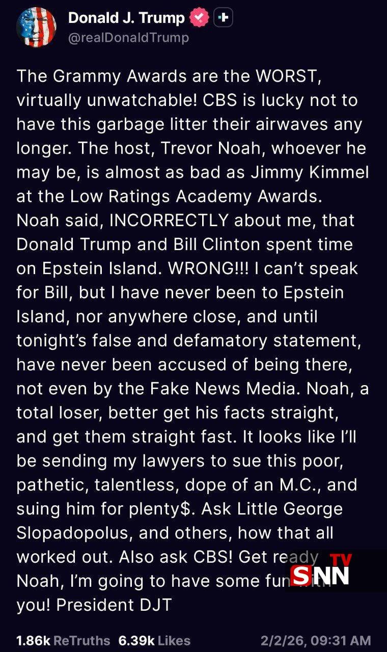 رئیس جمهوری آمریکا در پاسخ به انتقاد تروور نوآ، مجری مراسم گرمی، از دوستی او با جفری اپستین، مجرم جنسی محکوم و سرمایهدار بدنام، نوشت: «نوآ، به اشتباه در مورد من گفت که دونالد ترامپ و بیل کلینتون در جزیره اپستین وقت گذراندهاند. این حرف اشتباه است!